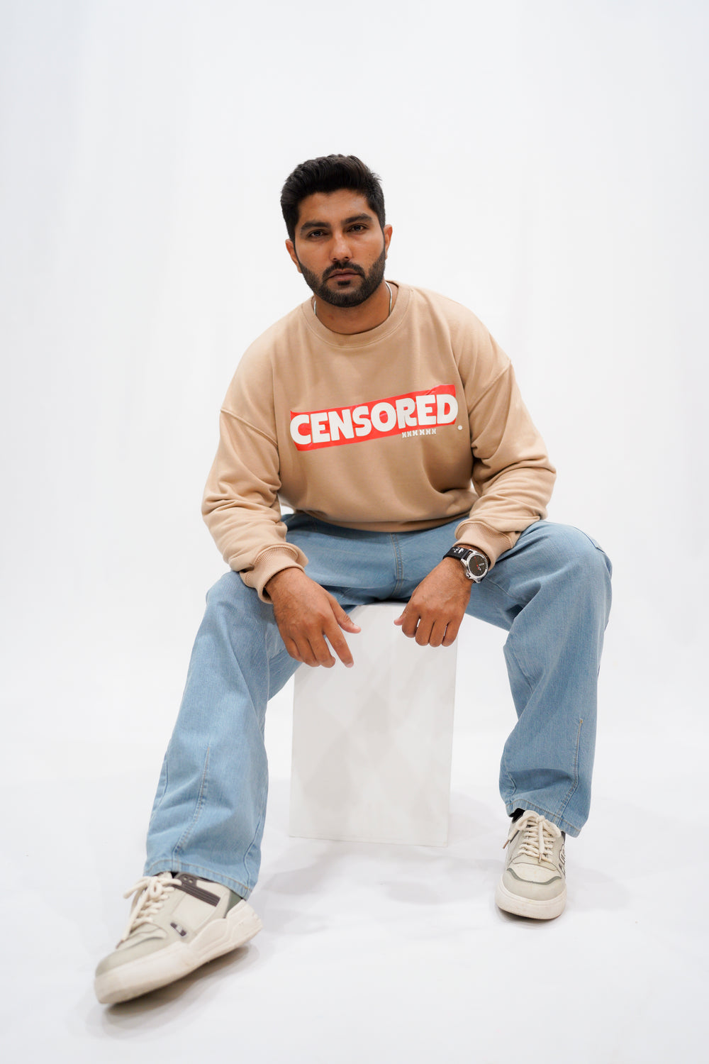 An oversized sweatshirt crafted from 100% 300gsm cotton terry fabric in camel beige color, with ultra premium digital rubber high density "CENSORED" print on front, with duct tape design digital print. Perfected for the fall / winter season, with heavy duty fabric. The world will censor you. Break free.